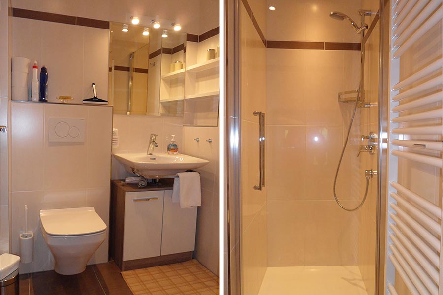 Bad Ausstattung: Dusche, (auch mit Überkopfdusche) und WC, Waschbecken, Kosmetikspiegel, Handtuchtrockner, Hand und Badetücher.