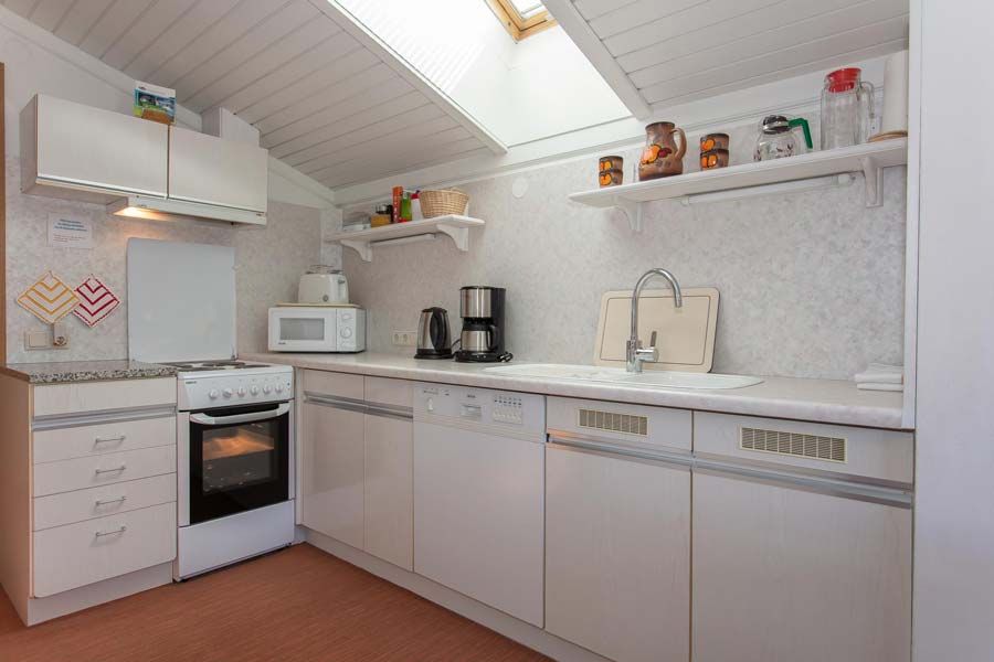 Wohnküche mit Couch, voll ausgestattet mit E-Herd inkl. Backofen, Geschirrspüler, Kühlschrank mit Gefrierfach, Kaffeemaschine, Mikrowelle, Wasserkocher, Toaster, Eierkocher